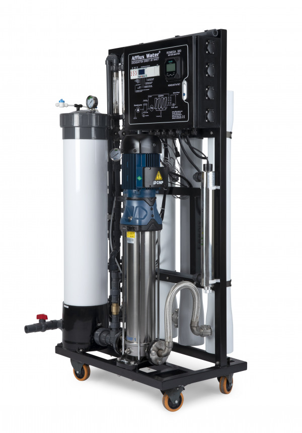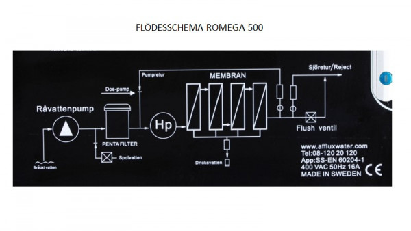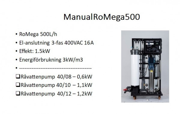 Avsaltningsanläggningen RoMega 500 är en komplett och nyckelfärdig anläggning. Det ingår membran som har kapacitet att producera minst 500l/h.